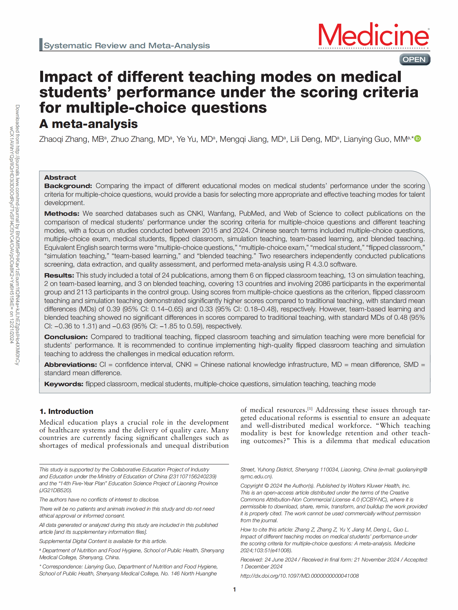 近日,我校教师郭连莹在《Medicine》上发表英文文章“Impact of different teaching modes on medical students’ performance under the scoring criteria for multiple-choice questionsA meta-analysis”。此项研究成果标志着我校在医学教育研究方法论领域取得了新的突破,获得了国际同行的认可。