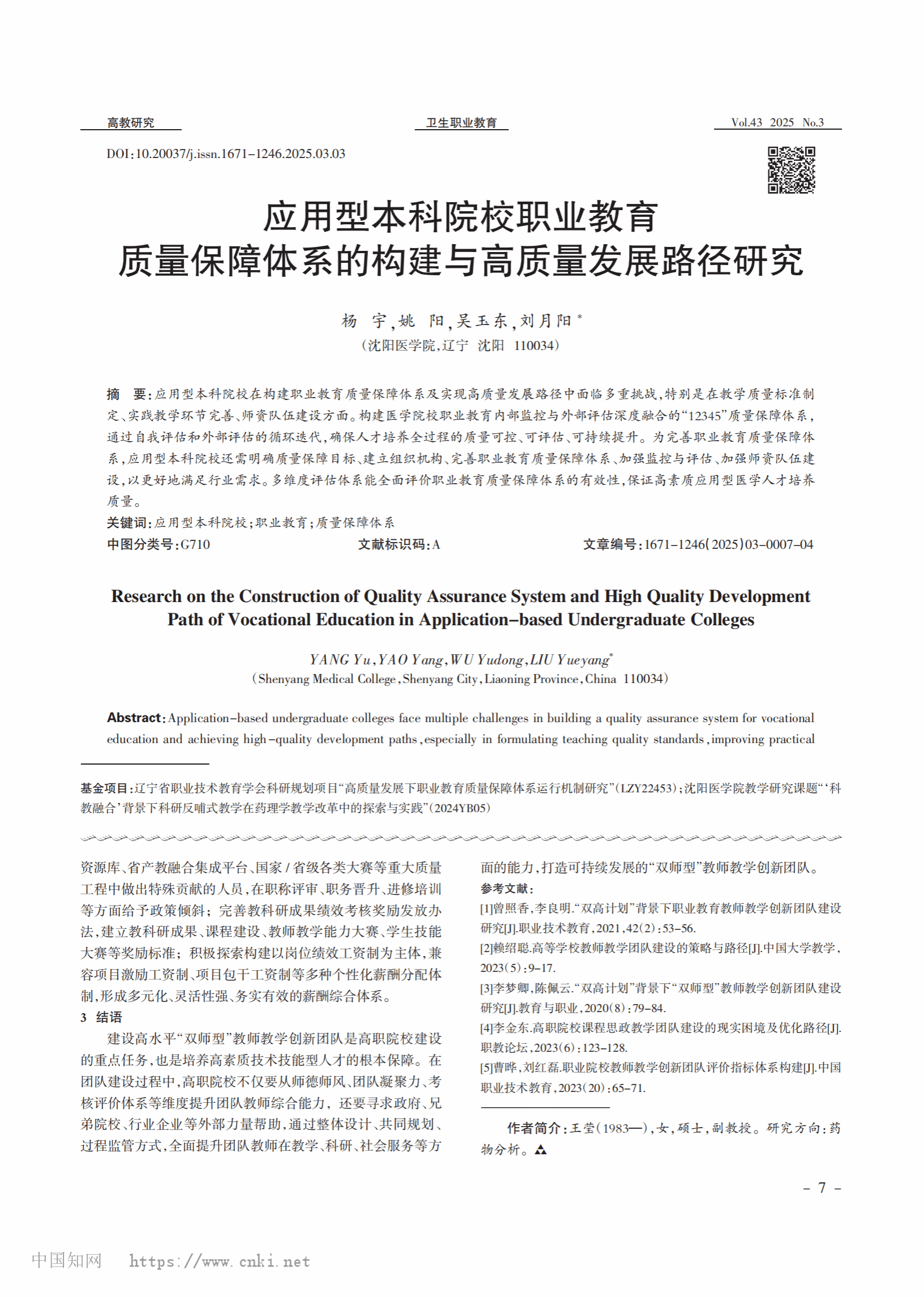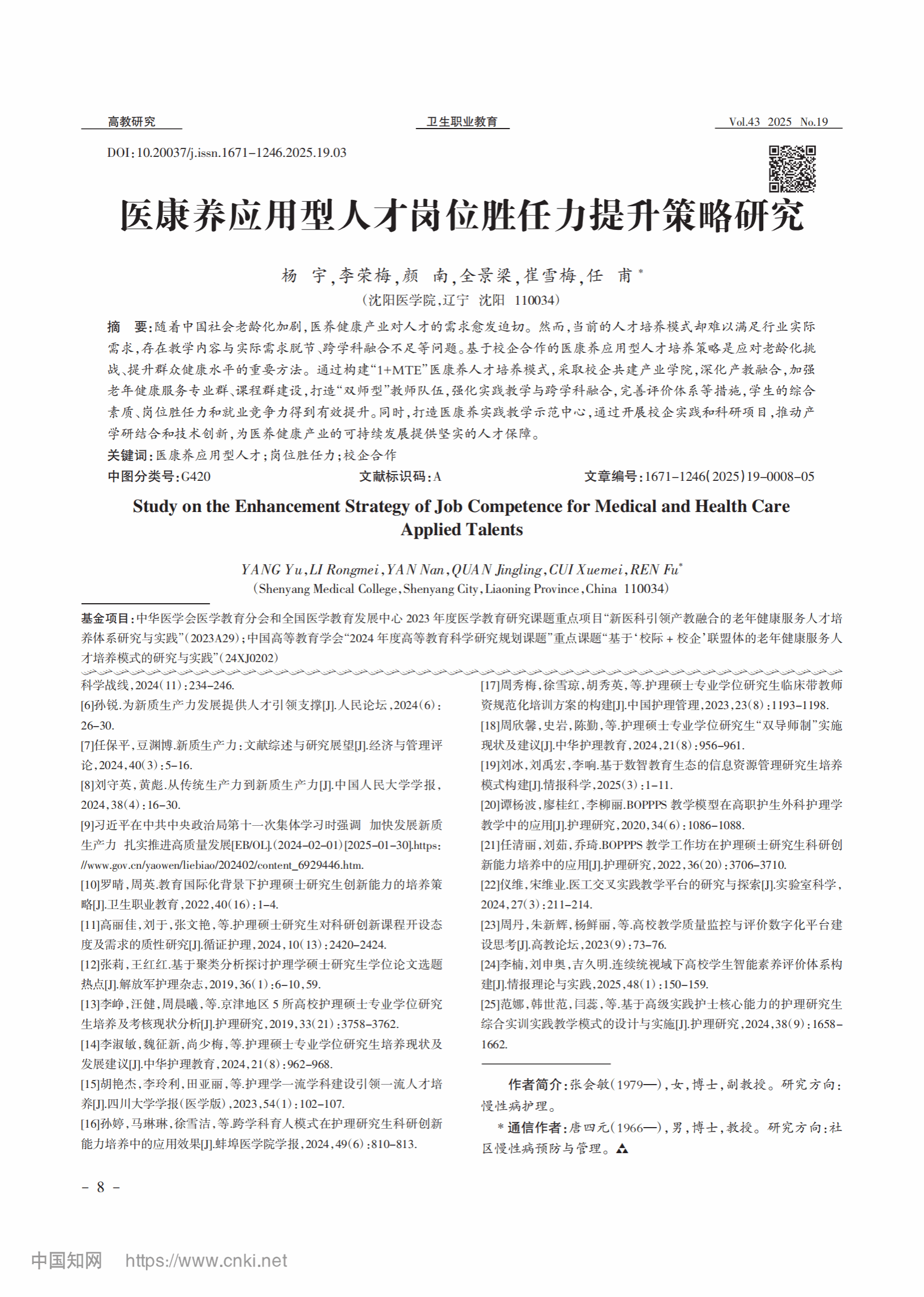 2025年,我校医学教育研究中心主任杨宇在国家级学术期刊《卫生职业教育》上连续发表两篇重要研究论文——《应用型本科院校职业教育质量保障体系的构建与高质量发展路径研究》与《医康养应用型人才岗位胜任力提升策略研究》。此次两篇成果的集中发表,标志着我校在医学职业教育与“医康养”复合型人才培养领域的理论研究与实践探索取得了系统性、联动性的重要进展,彰显了研究中心服务国家健康战略的学术担当。
